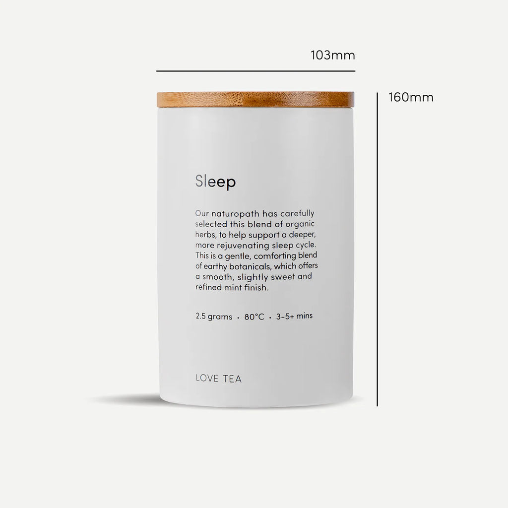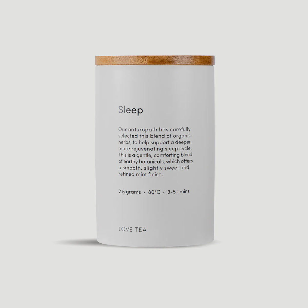 Our naturopath has carefully selected this blend of organic herbs, to help support a deeper, more rejuvenating sleep cycle. Herbs used in this blend, including passion flower, valerian and lavender, have traditionally been used to support the nervous system, aid relaxation and improve sleep quality. This is a gentle, comforting blend of earthy botanicals, which offers a smooth, slightly sweet and refined mint finish. This canister is supplied with 60g of loose leaf Sleep tea.