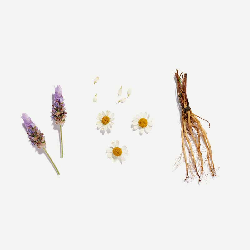 Valerian root (Valeriana officinalis), Licorice root (Glycyrrhiza Glabra), Spearmint (Mentha spicata), Chamomile (Matricaria chamomilla), Passionflower (Passiflora incarnata), Lavender (Lavandula angustifolia)